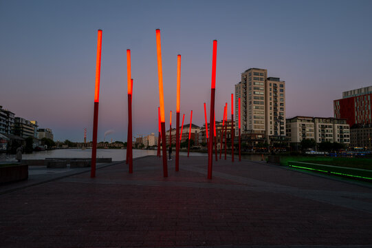 Red lightning posts in docklands at night. Dublin, Ireland.