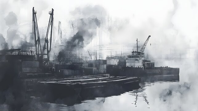 Dramatic monochrome industrial landscape with cargo containers cranes and heavy machinery at a busy harbor docks  Smoke and steam rising from the power plant create a moody