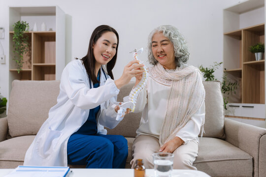 Portrait of female doctor physiotherapist or orthopedist showing to her woman patient model of spine in her office giving consultation about scoliosis or spinal problems during medical exam.