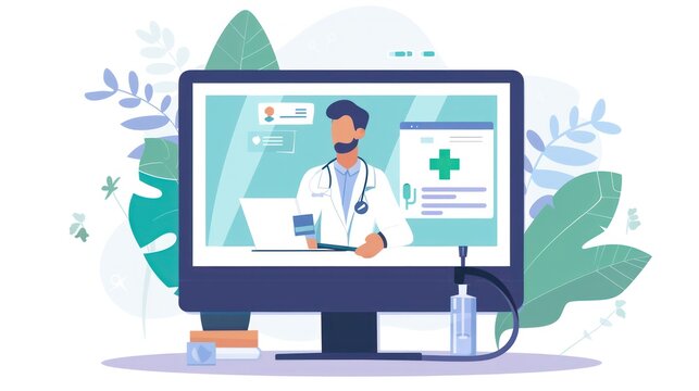 An image depicting the concept of online medicine or telemedicine, showcasing a patient using a video call on a digital device to consult with a doctor for medical advice and support.
