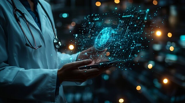 A futuristic image of a doctor holding a virtual health icon and medical record screen, with glowing network connections in the background