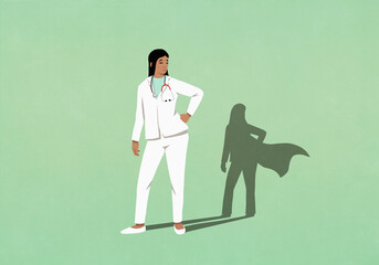 Superhero shadow of female doctor on green background