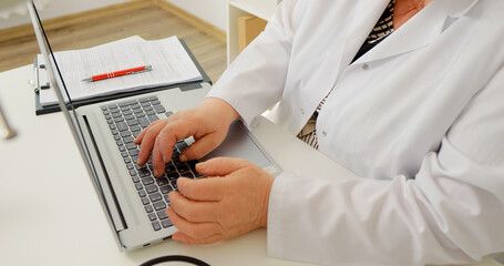 Male doctor sitting at desk and using laptop while working in doctor's office