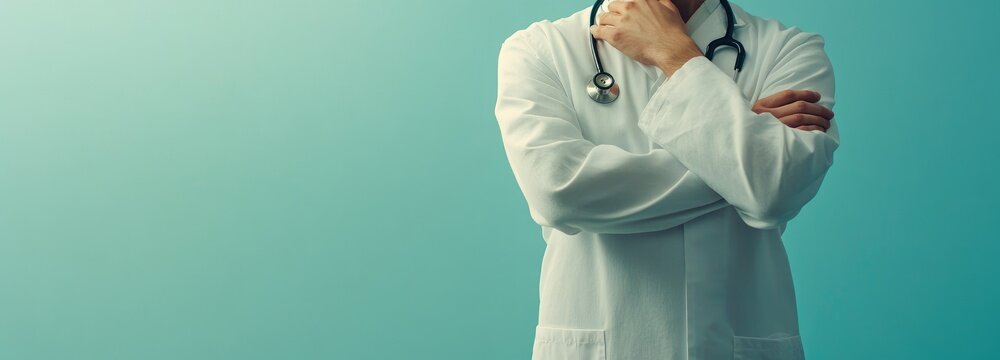 A male doctor wearing a white coat and a stethoscope with his arms crossed, suitable for medical design