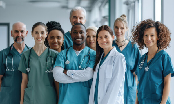 photo of a group of multicultural doctors and nurses standing and smiling while working at a hospital, wearing scrubs,  full view