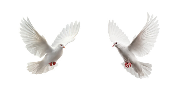 Two flying white doves isolated on transparent background, in PNG format