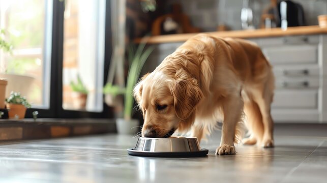 Create a realistic background with a dog eating from a bowl in a modern kitchen