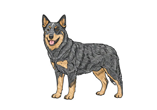Blue heeler drawing. It is a black and white outline image of a blue heeler, an intelligent and loyal Australian cattle dog. Vector sketch line art draw.