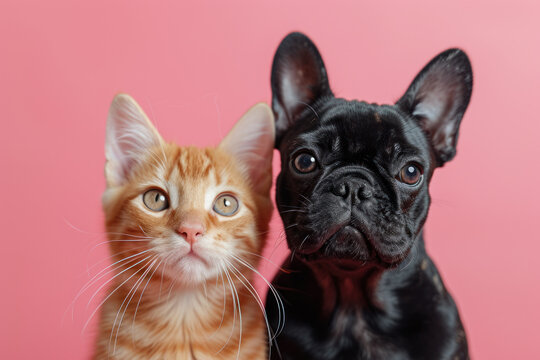 dog and cat on pink background isolated on grey