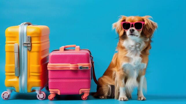 Travel concept cute pet dog in sunglasses with suitcase on the blue background , copy space