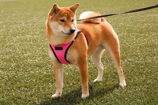 A happy mixed-breed female dog in a pink harness walking along the beach on the sand with the ocean waves blurred in the background. Smiley dog with big perky ears walking happily at the beach