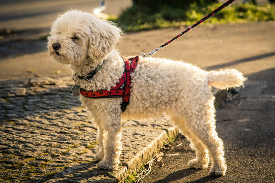 Puppy buckled into the backseat of a car with leather seats, fastened with a red harness and ready for a road trip.