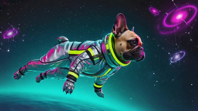 French bulldog wearing a futuristic spacesuit floats in the vast expanse of space, gazing towards distant planets and twinkling stars, creating a surreal and captivating scene