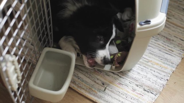 The dog is lying in a large plastic transport box for transporting dogs on a soft litter.