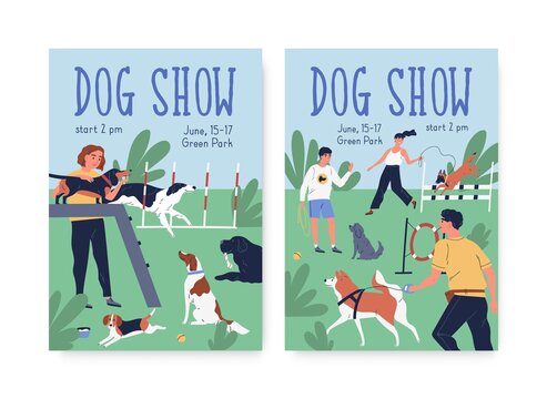 Advertising posters for dog agility show. Cynologist training performance at playground. Vertical placards for pet competition. Scene with trained puppies. Vector illustration in flat cartoon style