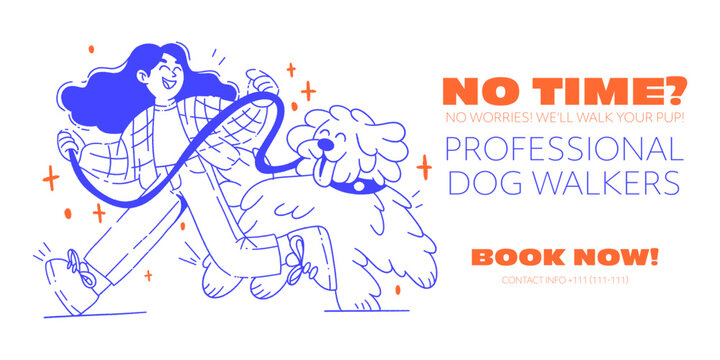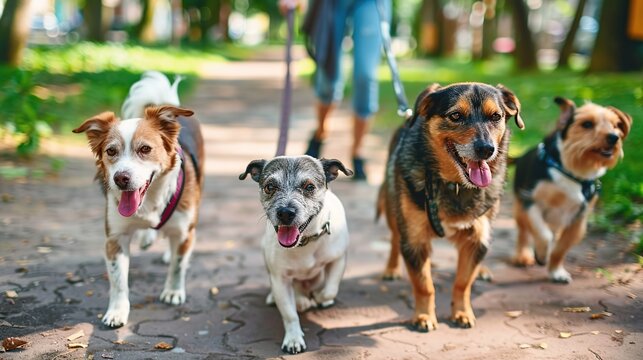 Professional Dog Walkers. Dog Walking Business, Services. Professional dog walker, pet sitter walking with different breed and rescue dogs on leash at city park