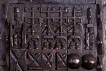 Detail of African Dogon Granary window hand carved in wood.