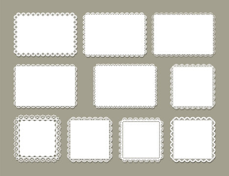 Set of Decorative white rectangle doily border, Vintage round lace paper doily frame, Paper Cutout Design, paper cutting, laser cut square frames. cute template for baby shower, wedding scrapbooking.