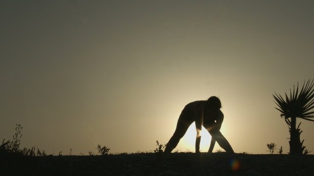 Silhouette of active woman practicing yoga positions, doing exercises at sunset