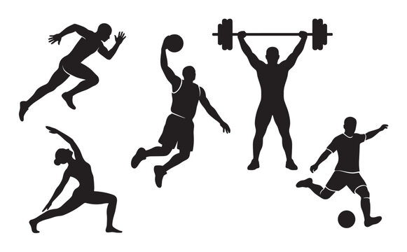 Collection of black sport silhouettes showing athletes running, playing basketball, weightlifting, doing yoga, and kicking a soccer ball in dynamic action poses