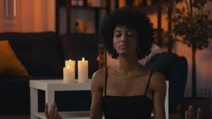 Focused African American woman practicing yoga asanas at home, meditation time