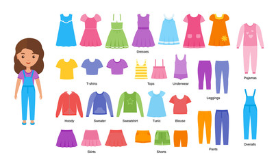 Girl clothes. Vector. Baby clothing. Cartoon female character paper doll with casual cloths set isolated on white background. Illustration of children dresses, pants, skirts, shorts, knitwear, blouse.