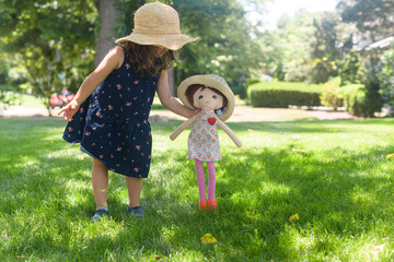 Adorable hispanic girl sitting on floor playing with baby doll at kindergarten