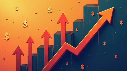 A stock illustration representing Economic growth in orange and navy blue with blending gradients, dollar signs, and rising arrows. Texture overlays add visual hierarchy and spatial depth.