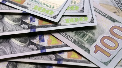 Lot of fiat money bills of one hundred US dollars overlapping each other. Large amount of paper banknotes gradually covering the surface of table. Concept of successful investments and income growth