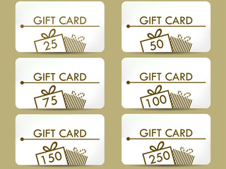 A set of gift certificates with a golden bow on 100$, 150$, 200$, 250$.
