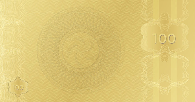 Golden Banknote template 100 with guilloche pattern watermarks border. Expensive Gift certificate Voucher. Background usable for coupon, banknote, money design, currency, note, check. in gold