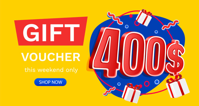 Gift voucher 400 dollar, Check and gift box. Sale banner and poster. Vector illustration