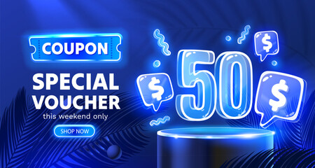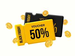Black Friday voucher design with bold yellow and black coupon cards, featuring 50% discount text surrounded by floating golden coins. Black Friday coupon in 3d vector illustration. Vector illustration