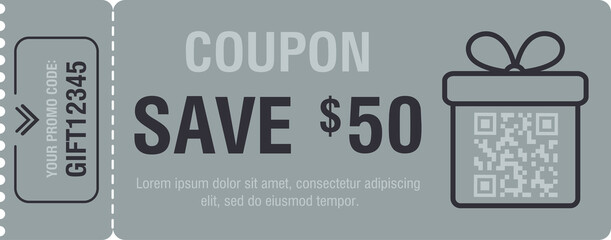 Gift cards vouchers with monetary reward in 50 dollars with simple linear gift box illustration, front and back isolated templates with qr code place
