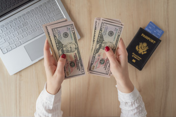 woman hold banknote 50 U.S. dollars in hand and count it. American passport with boarding pass and laptop on the table. Travel concept. Cash. Flat lay