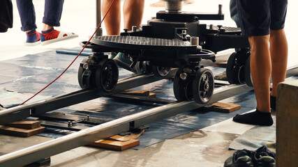 Dolly. Film production Dolly track. Production crew team setting dolly track. dolly car for shooting movie in studio. Wheel track for video camera.