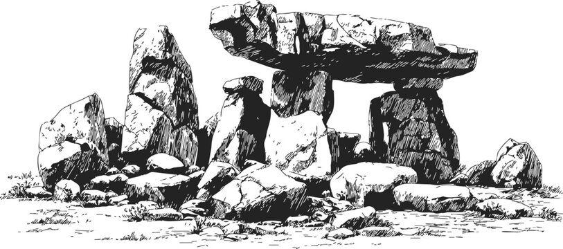 Big rocks construction, ancient dolmen from heavy stone blocks. Large rubbles slabs. Prehistoric megalith. Realistic hand-drawn graphic vector illustration isolated on white background