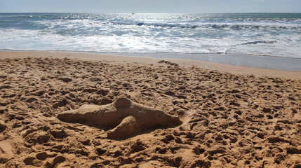 Beige Sand Sculpture of Marine Life on Beach