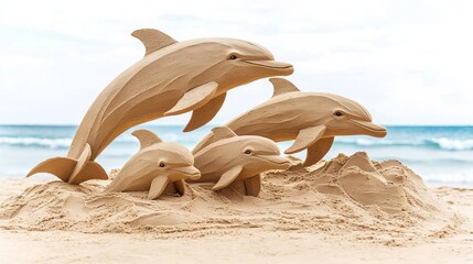 Sand sculpture outdoor craft, Wooden dolphin sculptures on a sandy beach create a serene coastal atmosphere.