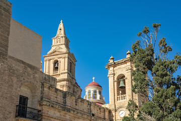 View of Parish Church of Mellieha, with its bell tower and red-domed roof standing out against the stark blue sky, Mellieha, Malta.