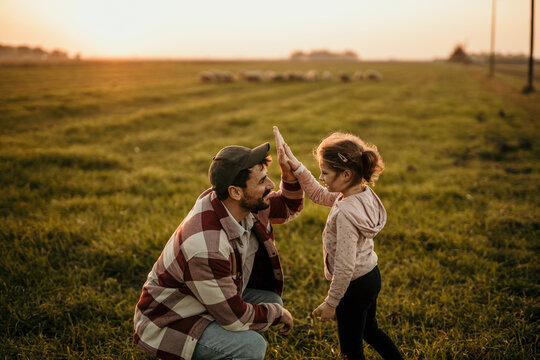 Happy Caucasian family on holiday vacation. Smiling father and little daughter holding hands and walking together on the meadow field. Parent with cute child girl relax and enjoy an outdoor lifestyle.