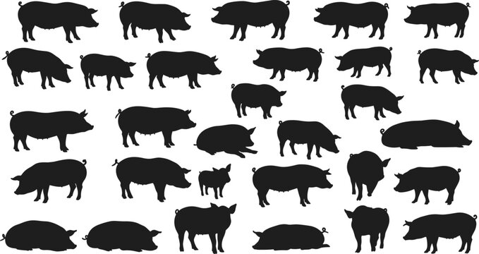 Black pig silhouettes collection, farm animal vector illustration, domestic livestock shapes, walking standing eating sleeping pigs, baby piglet icons, graphic design elements