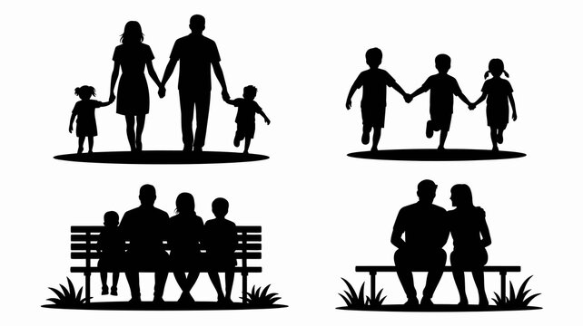 a collection of silhouette images depicts various family scenes including parents with children walking and sitting together in parks high quality professional detailed modern elegant stylish