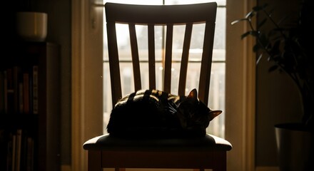 A tabby cat naps peacefully on a wooden chair, bathed in golden sunlight from a window, creating a warm, cozy, and tranquil domestic scene with beautiful natural lighting