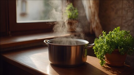 boiling water on a gas stove, vigorous bubbling and steam in a modest home kitchen. Ideal for cooking scenes, domestic life, safety, culinary b-roll.