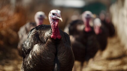 A domestic turkey stands prominently in a farm setting with other turkeys blurred in the background under bright daylight