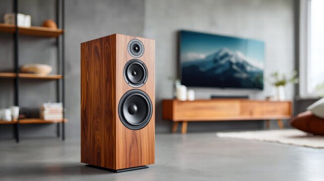 Wooden speaker in a modern living room setting