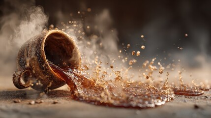 Hot liquid spills from tipped over mug, creating a puddle and steam on the flat surface during morning light in a kitchen setting