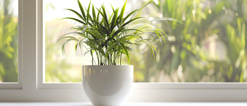 Sunlight bathes a potted spider plant on a windowsill, a slice of domestic greenery.