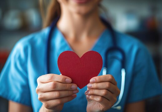 Woman doctor hands holding red heart on wide white background donate for hospital care concept. Panoramic world heart day and world health day, CSR community, foster support patient. World heart day